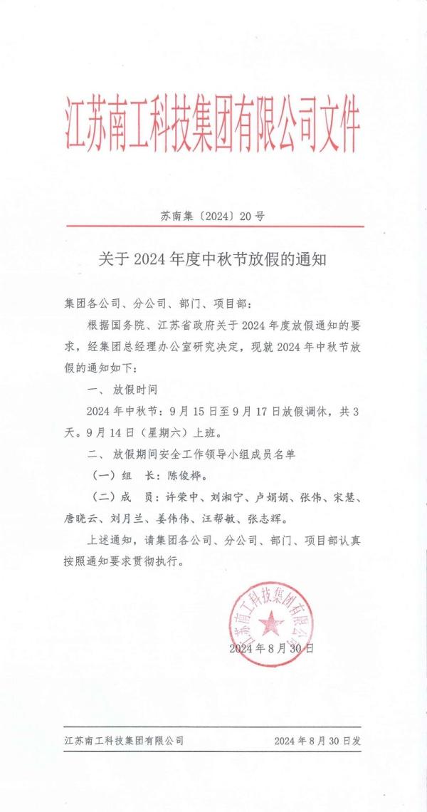 關于2024年度中秋節放假的通知