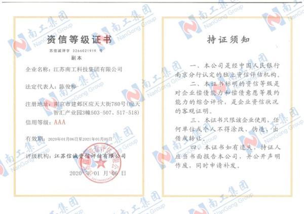 您的位置:集團首頁 >> 走進南工 >> 企業榮譽 >> 企業榮譽 >> AAA資信等級證書
