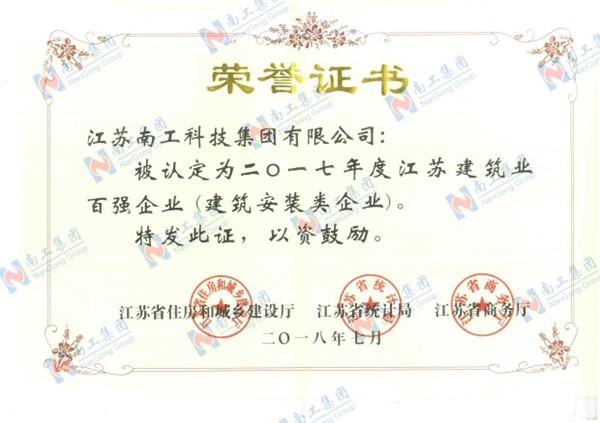 2017年江蘇建筑業百強企業榮譽證書