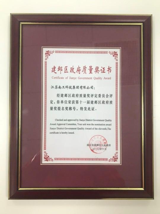 建鄴區政府質量獎證書