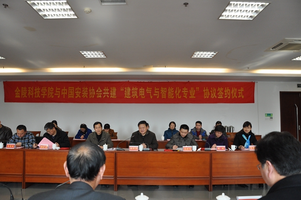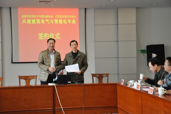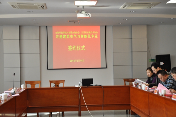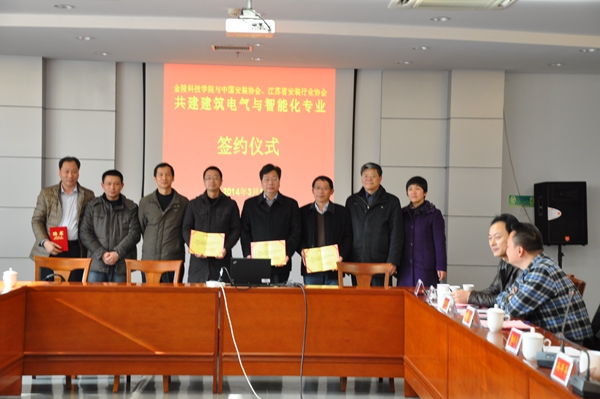 2014年3月14日,金陵科技學院與中國安裝協會智能化與消防工程分會、江蘇省安裝行業協會智能消防電子專業委員會簽訂了共建“建筑電氣與智能化專業”的協議。出席協議簽訂儀式的有金陵科技學院副校長馮年華、金陵科技學院教務處副處長吳鐘鳴、金陵科技學院機電工程學院院長鞠全勇、黨總支書記趙士安、副院長周擴建、鄭李明、副書記陳建、樓宇系主任牟福元等領導和老師。江蘇省安裝行業協會會長鄒金林;中國安裝協會智能化與消防工程分會會長、江蘇省行業協會智能消防電子分會會長、江蘇南工科技集團有限公司總經理陳曉;分會秘書長助理余晶等出席了會議。