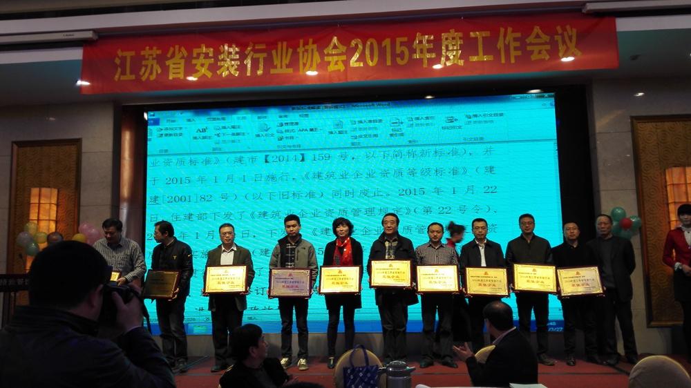 2015327日,陳曉總經理、吳雪峰副總經理等參加江蘇省安裝行業協會在揚州召開的2015年度工作會議。吳雪峰副總經理代表集團領取了集團榮獲的《江蘇省安裝行業協會》最佳企業等榮譽證書。