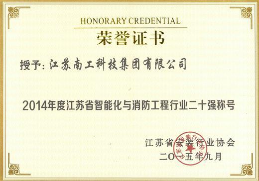 2015年12月18日,江蘇省安裝行業協會智能化與消防工程分會一屆三次會員代表暨江蘇省智能建筑高層論壇在南京召開。在本次會議上集團榮獲江蘇省安裝行業協會頒發的《2014年江蘇省智能化與消防工程行業二十強》稱號。