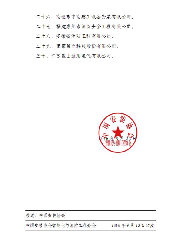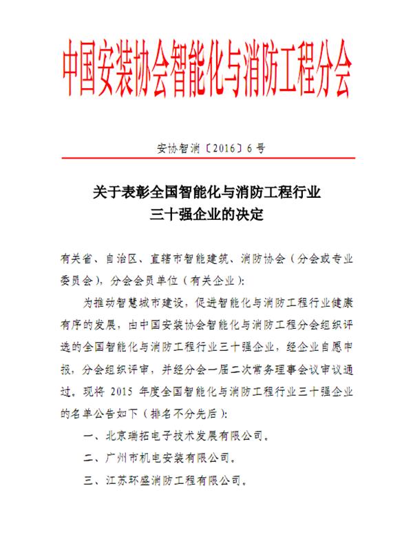 2016年9月23日,由中國安裝協會智能化與消防工程分會組織評選的“全國智能化與消防工程行業三十強”企業名單正式公布,集團榮獲了“全國智能化與消防工程行業三十強”企業的殊榮。