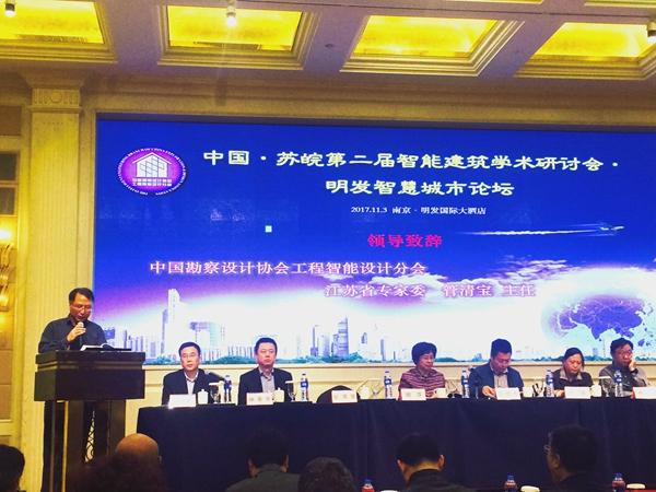 2017年11月3日,中國·蘇皖第二屆智能建筑學術研討會明發智慧城市論壇在南京明發國際大酒店召開。參加研討會的嘉賓有中國勘察設計協會智能設計工程分會會長胡萍,《數據中心數據規范》標準編寫組組長鐘景華,中國勘察設計協會智能設計工程分會湖北省專家委員會主任熊江、安徽省專家委員會主任萬力、山東省專家委員會主任張釗、江蘇省專家委員會主任管清寶,江蘇南工科技集團有限公司執行董事陳俊樺及集團副總經理吳雪峰等近300多人參加了研討會。