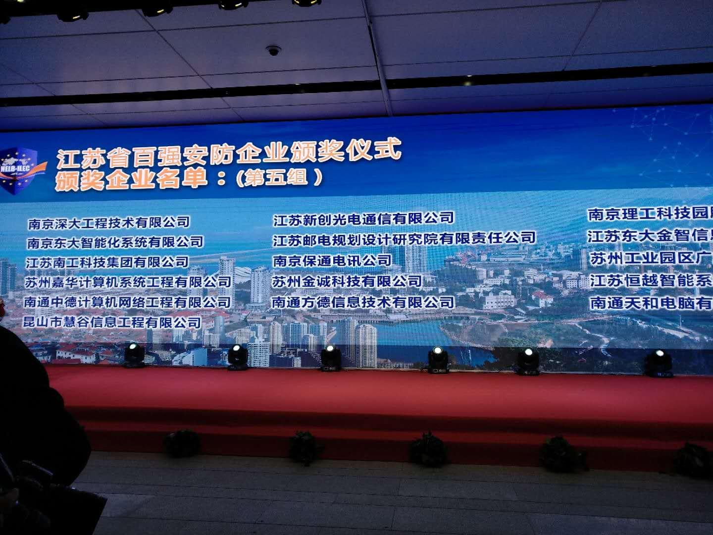 2017年12月12日,江蘇省百強安防企業頒獎儀式在“連云港論壇暨警用裝備和公共安全產品博覽會”現場舉行。參加會議的有原公安部科技信息局副局長牛晉,南京安全技術防范行業協會秘書長張亞忠、副秘書長查雪松,南京安全技術防范行業協會副理事長、江蘇南工科技集團執行董事陳俊樺等300多人。陳俊樺執行董事參加了頒獎活動,并代表江蘇南工科技集團有限公司領取了“江蘇省百強安防企業”獎狀。