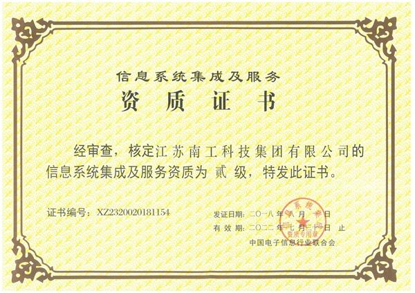 2018年8月1日,江蘇南工科技集團有限公司獲得信息系統集成及服務二級資質。