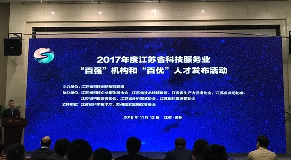 2018年11月12日,2017年度江蘇省科技服務業“百強”機構和“百優”人才發布活動在蘇州清山會議中心舉行。參加會議的有江蘇省科技廳副廳長景茂,江蘇省科技廳科技機構與條件處副處長李漢中,江蘇省科技創新服務聯盟理事長、省生產力促進中心主任趙志強,蘇州高新區管委會副主任陶冠紅,蘇州高新區管委會科創局局長顧彩亞等領導及專家和各百強機構人才代表。江蘇南工科技集團有限公司副總經理吳雪峰參加了會議。