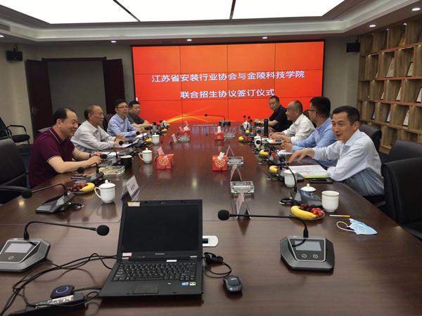 2020年5月11日,江蘇省安裝行業協會與金陵科技學院繼續教育學院在江蘇南工科技集團有限公司進行校協聯合招生協議簽字儀式。參加儀式的有金陵科技學院繼續教育學院院長邢紅飛、副院長吳學松;金陵科技學院機電學院院長鞠全勇,樓宇系主任牟福元,辦公室主任張玉,項目負責人姜玉東。江蘇省安裝行業協會駐會副會長鄒金林、副會長陳曉、秘書長吳輝、副秘書長席天陽,江蘇省安裝行業協會智能化與消防工程分會副會長、江蘇南工科技集團有限公司執行董事陳俊樺,分會副秘書長余晶等。
