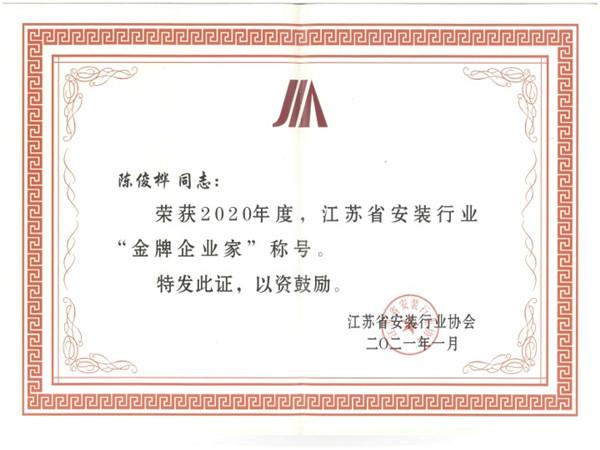 會議一致通過了吸納新會員單位、變更副會長人選等提案。表彰了江蘇省安裝行業2020年度“安裝百強企業”、“品牌企業”、“品牌企業家”。江蘇南工科技集團有限公司榮獲江蘇省安裝行業2020年度“安裝百強企業”稱號,集團執行董事陳俊樺榮獲“金牌企業家”稱號。