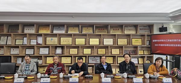 2021年4月20日,金陵科技學院與江蘇省安裝行業協會聯合招生座談會在江蘇南工科技集團有限公司召開。參加座談會的有金陵科技學院繼續教育學院院長陳玉林、學歷教育科主任黃一兵,金陵科技學院機電學院院長鞠全勇、樓宇系主任牟福元、辦公室主任張玉、項目負責人姜玉東,江蘇省安裝行業協會會長助理顧建生、副會長陳曉、秘書長吳輝、副秘書長席天陽,江蘇省安裝行業協會智能化與消防工程分會副秘書長余晶、辦公室主任陳怡帆等。
