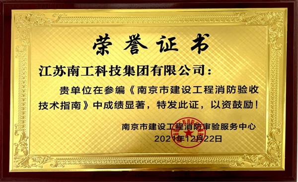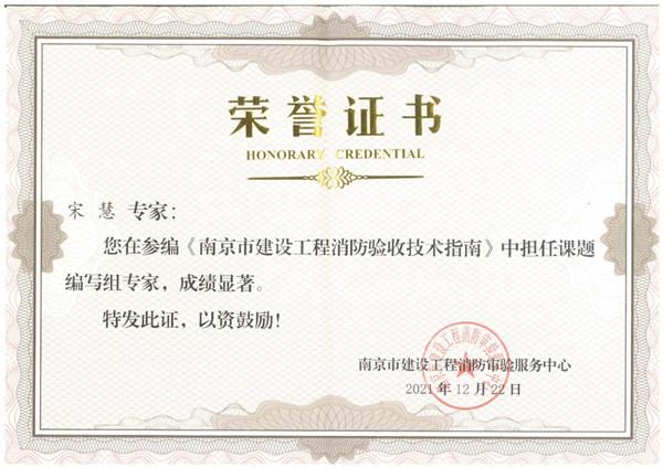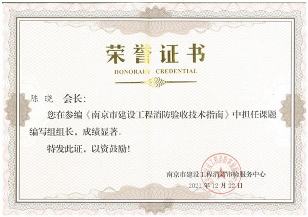 陳曉總經理作為編寫組組長、宋慧作為編寫組專家受到了南京市建設工程消防審驗服務中心、江蘇省安裝行業協會等一致好評,并獲得榮譽證書。