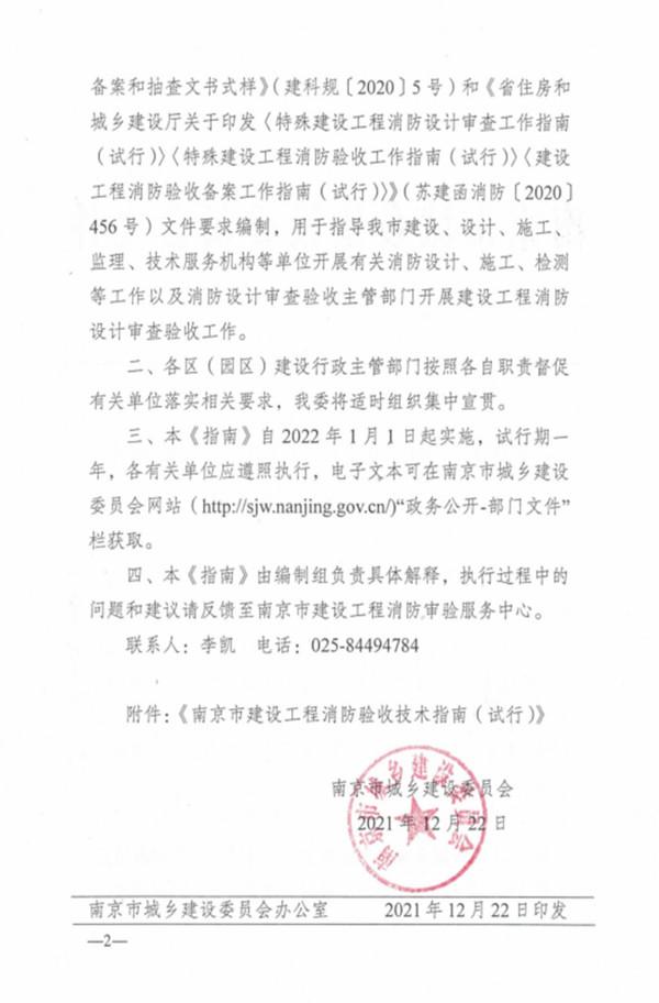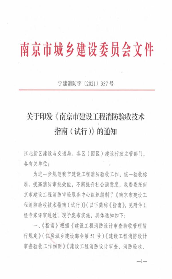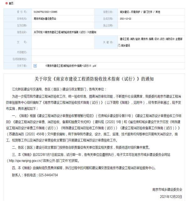 12月22日,南京市城鄉建設委員會正式發布《南京市建設工程消防驗收技術指南》,從2022年1月1日起開始試行。