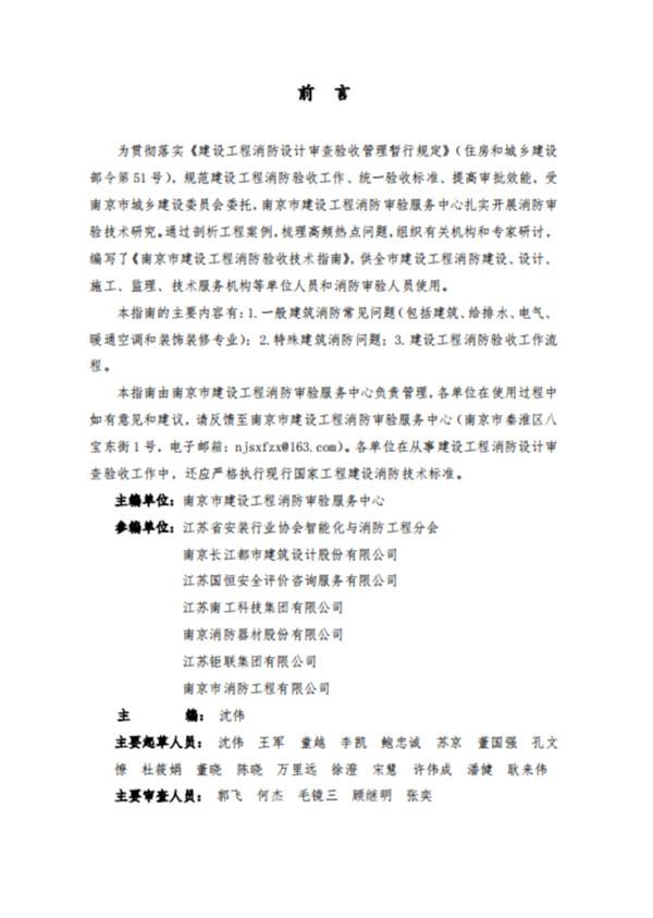 《南京市建設工程消防驗收技術指南》的編寫是為了貫徹落實《建設工程消防設計審查驗收管理暫行規定》(住房和城鄉建設部令第 51 號),提高消防工程設計審查驗收質量,助力消防驗收,供全市建設工程消防建設、設計、施工、監理等責任主體人員和消防審驗人員使用。