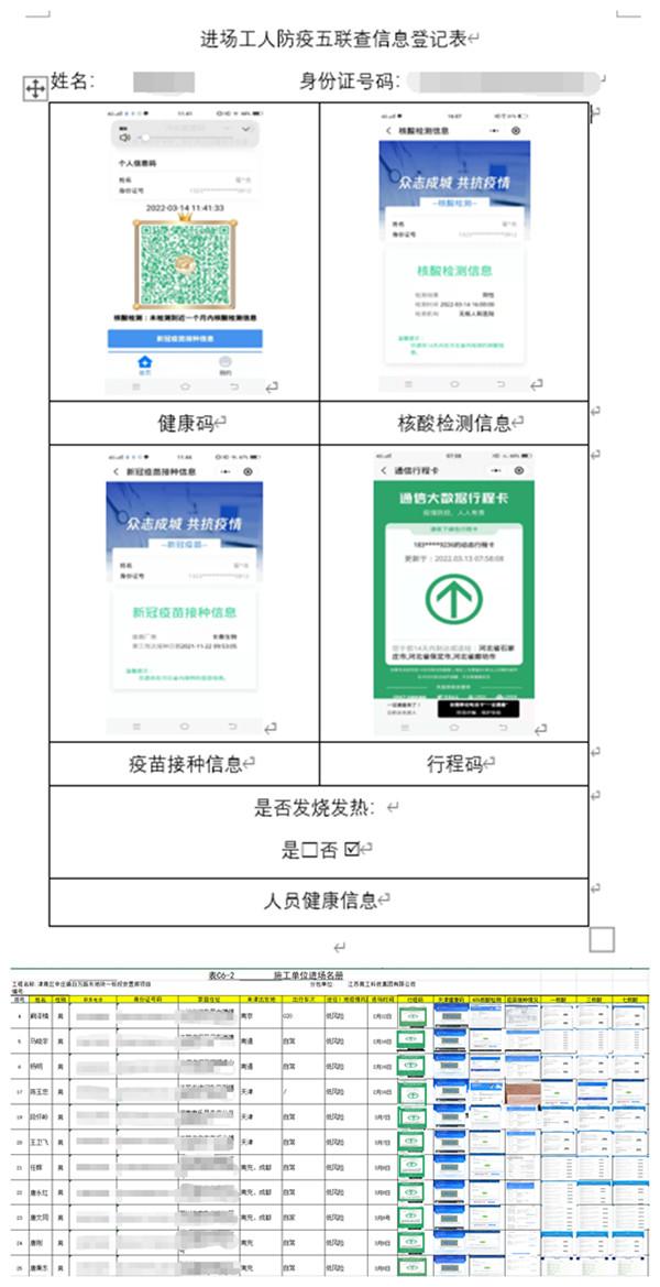 嚴格落實疫情防控要求,新入場人員一人一檔,一三七三次核算檢測結果陰性方可從臨時觀察區轉入集體宿舍,方可進入工地施工。建筑工人實名制通道處和生活區分別設立體溫監測點,對所有施工現場人員進行體溫檢測和“健康碼”查驗,核對人員身份和健康狀況。