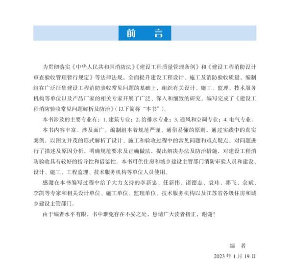 為貫徹落實《中華人民共和國消防法》《建設工程質量管理條例》和《建設工程消防設計審查驗收管理暫行規定》等法律法規,全面提升建設工程設計、施工及消防驗收質量,編制組結合最新的《建筑防火通用規范》GB 55037—2022、《消防設施通用規范》GB 55036—2022等標準規范,在廣泛征集建設工程消防驗收常見問題的基礎上,組織有關設計、施工、監理、技術服務機構等單位以及產品廠家的相關專家開展了廣泛、深入和細致的研究,編寫完成了《建設工程消防驗收常見問題解析及防治》(以下簡稱“本書”)。
