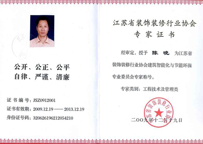 江蘇省裝飾裝修行業協會專家證書(陳曉)