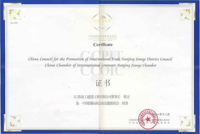 中國國際商會南京建鄴商會理事證書(英方)