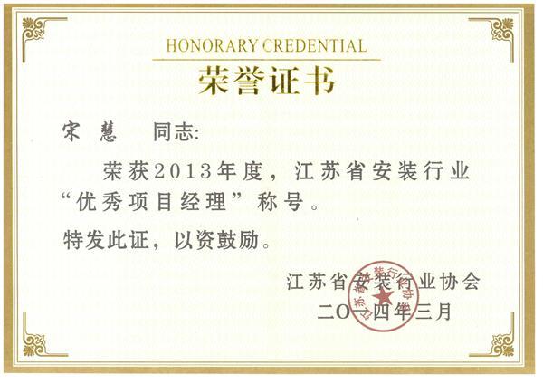 優秀項目經理榮譽證書(宋慧)