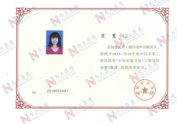 2016年度中國安裝之星(科創城)項目經理榮譽證書-宋慧