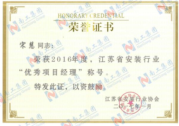 2016年度江蘇省安裝行業協會優秀項目經理-宋慧