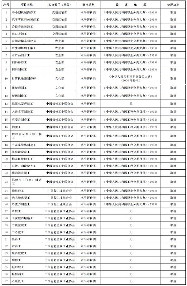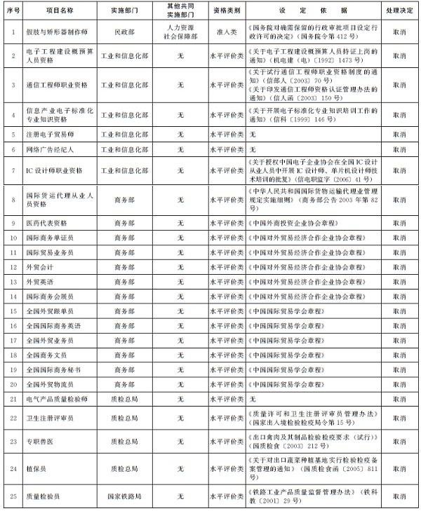 務院部門和全國性行業協會、學會自行設置的水平評價類職業資格一律取消;有