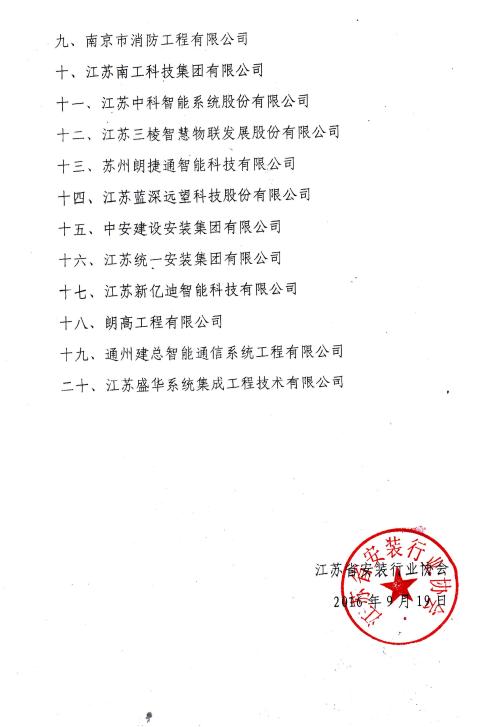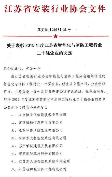 關于表彰2015年度江蘇省智能化與消防工程行業二十強企業的決定