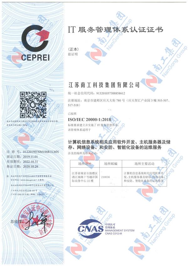您的位置:集團首頁 >> 走進南工 >> 企業資質 >> IT服務管理體系認證證書