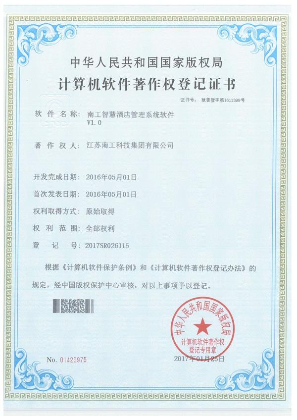 南工智慧酒店管理系統軟件證書